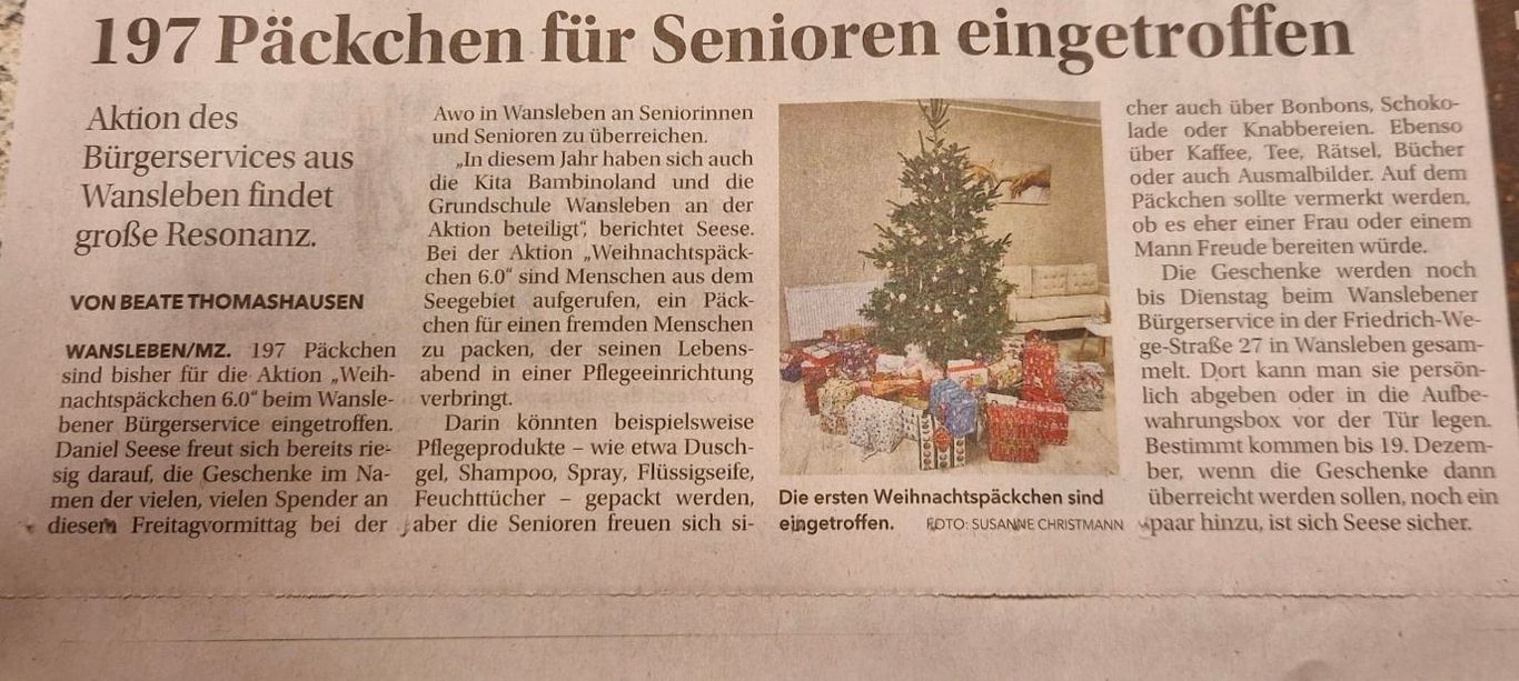 Der Wanslebener Bürgerservice ist im vollen Gange, die letzten Päckchen werden abgeholt oder auch gebracht. Sogar verschickt? Ja, wir haben sehr viele Päckchen erhalten aus, Bayern, Sachsen, Berlin, Nordrhein-Westfalen und Rheinland-Pfalz. Es ist atemberaubend, welche Kreise unsere Aktion nimmt. Aktuell liegen wir über unserer Anzahl vom letzten Jahr (219 Päckchen). Aktuell haben wir über 240 Päckchen, WAHNSINN!!!! Wir bedanken uns bei allen Spendern, die ein Herz haben, für einsame Senioren in Pflegeeinrichtungen.